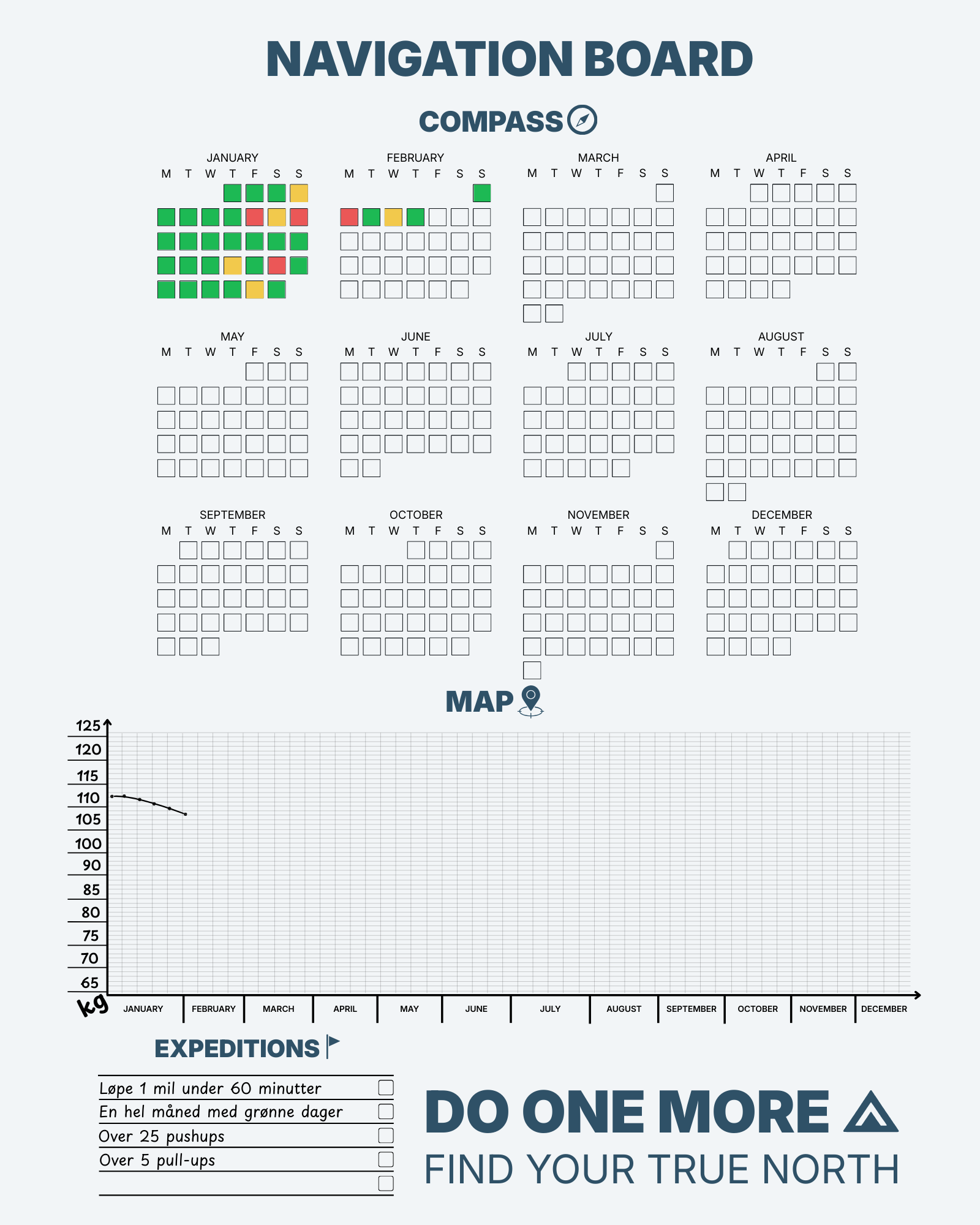 Her samles Daily Navigation, Expeditions og Map på én stor flate, slik at du ser dagene, målene og utviklingen din gjennom hele året.